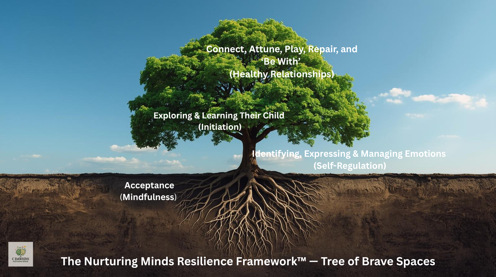 The Nurturing Minds Resilience Framework™ uses this tree as a visual metaphor to show how resilience develops from the ground up — within ourselves, our children, and our communities.